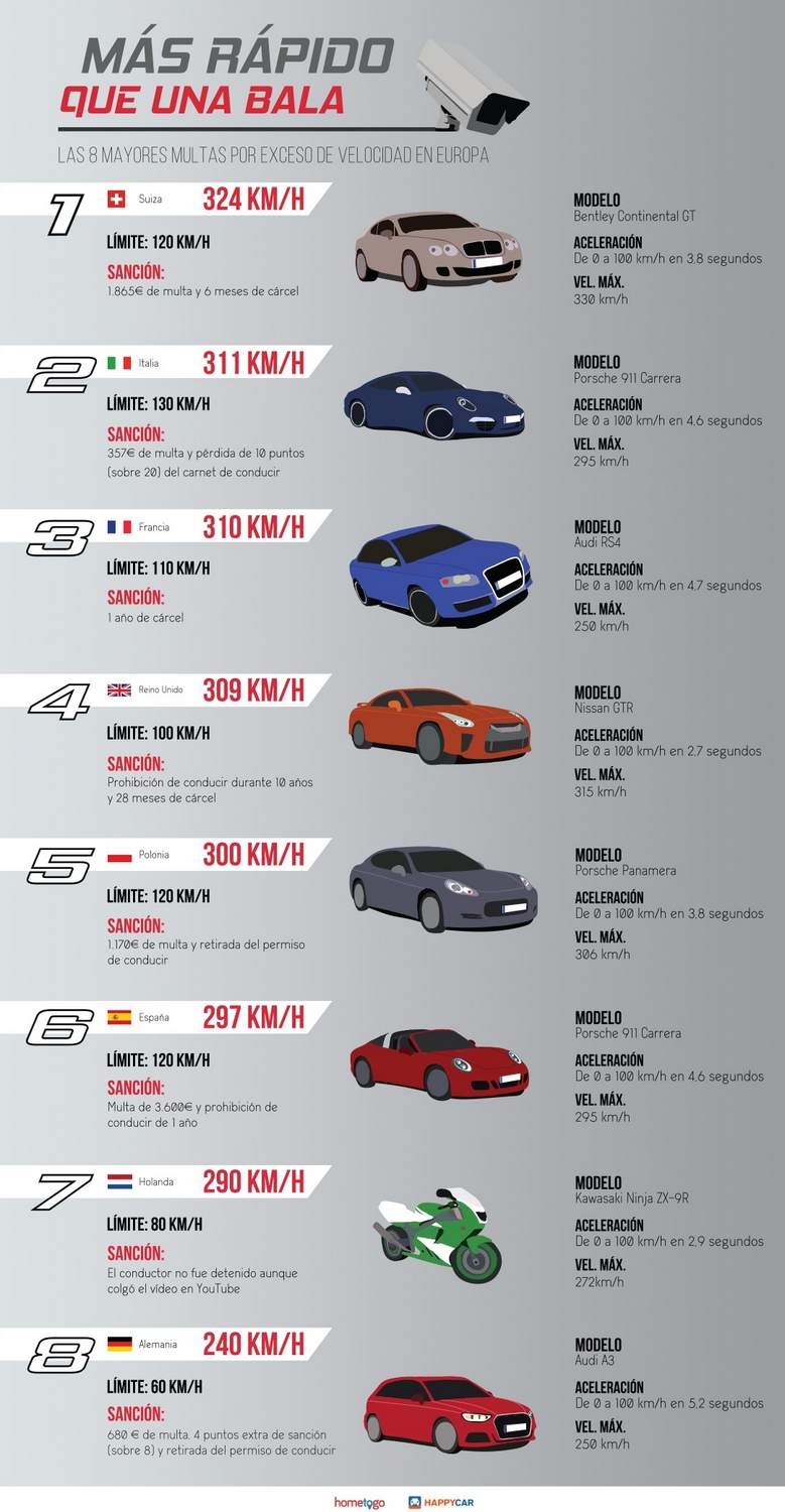 En esta infografía podemos ver el exceso de velocidad justo en el instante en que el temerario conductor fue captado en plena infracción por los radares de tráfico con algunos datos complementarios, como el país donde tuvo lugar esa infracción. También podemos ver la multa que se aplicó en cada caso y la información sobre el coche empleado.
